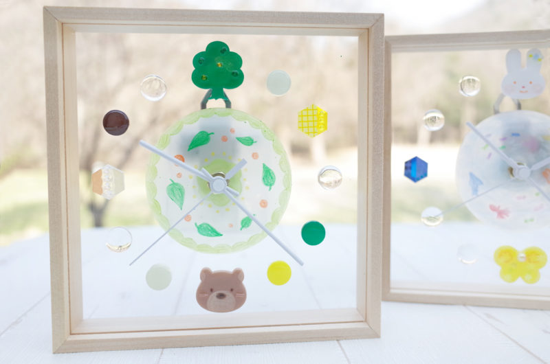 レジンで作ったモチーフを透明アクリル板に貼り付けて、木のフレームがおしゃれな壁掛け時計を作りましょう!モチーフの形はチョウチョやお花、うさぎや小鳥など…18種の中から選べます!(サイズ:約17cm×17cm×奥行3cm)